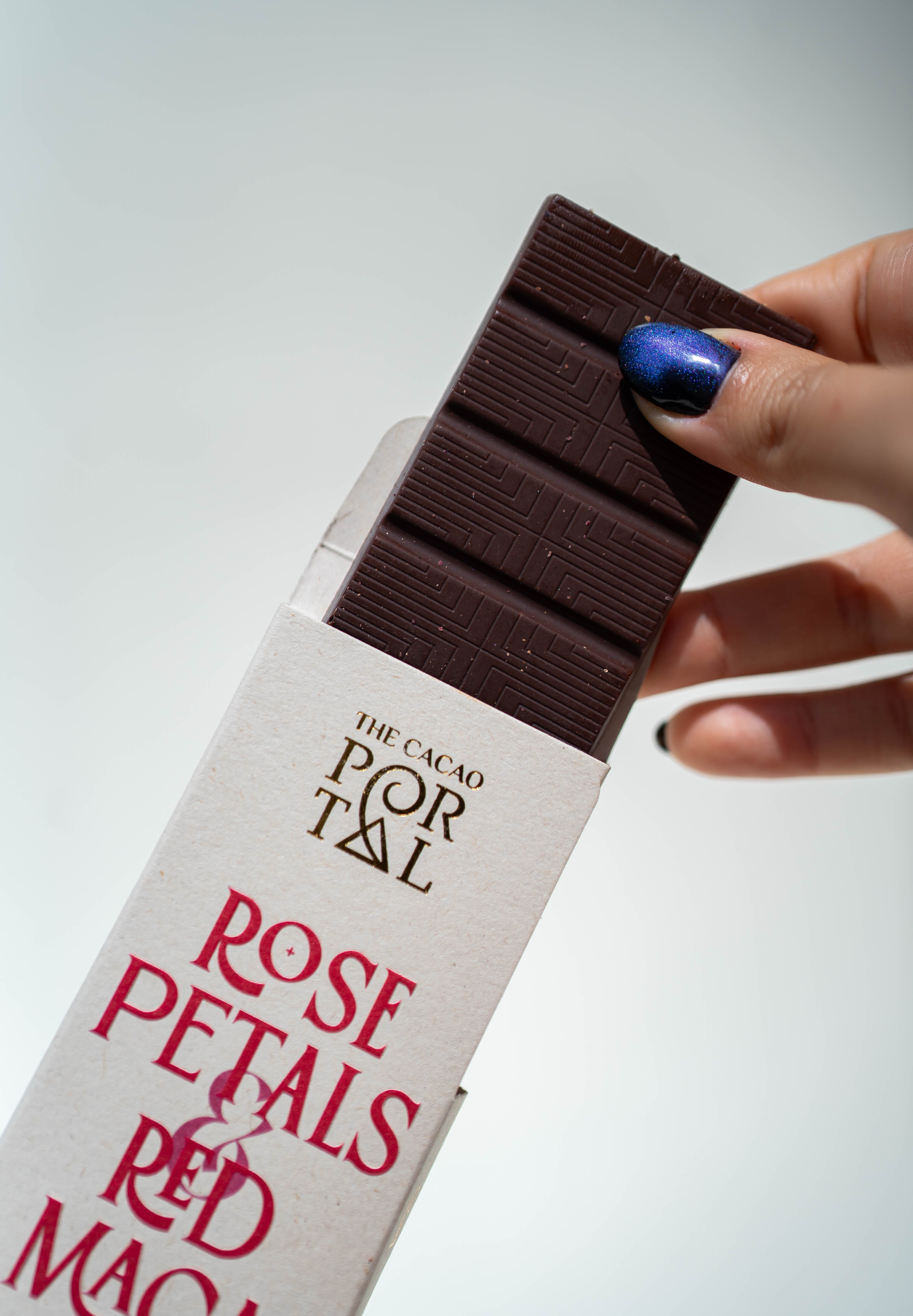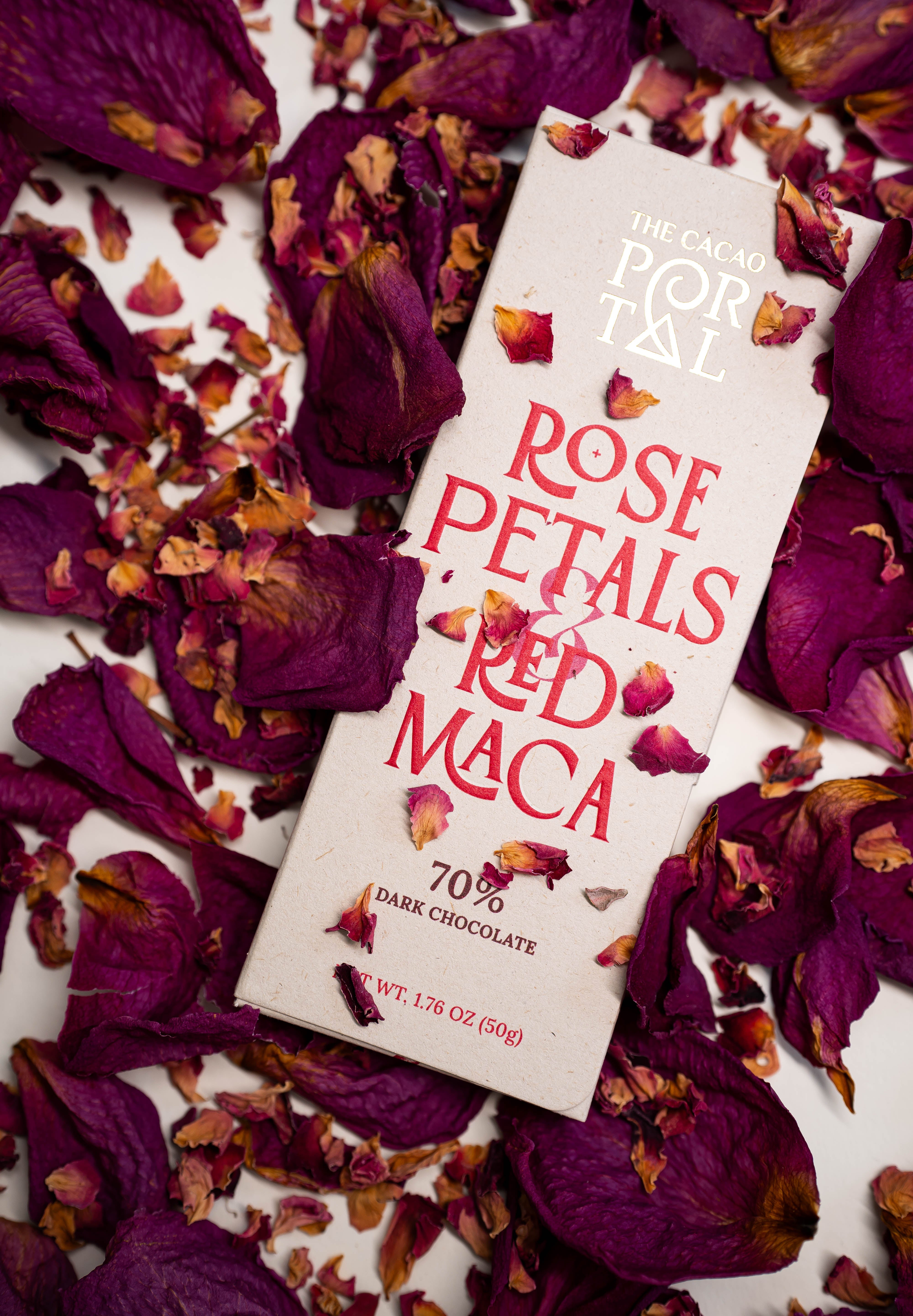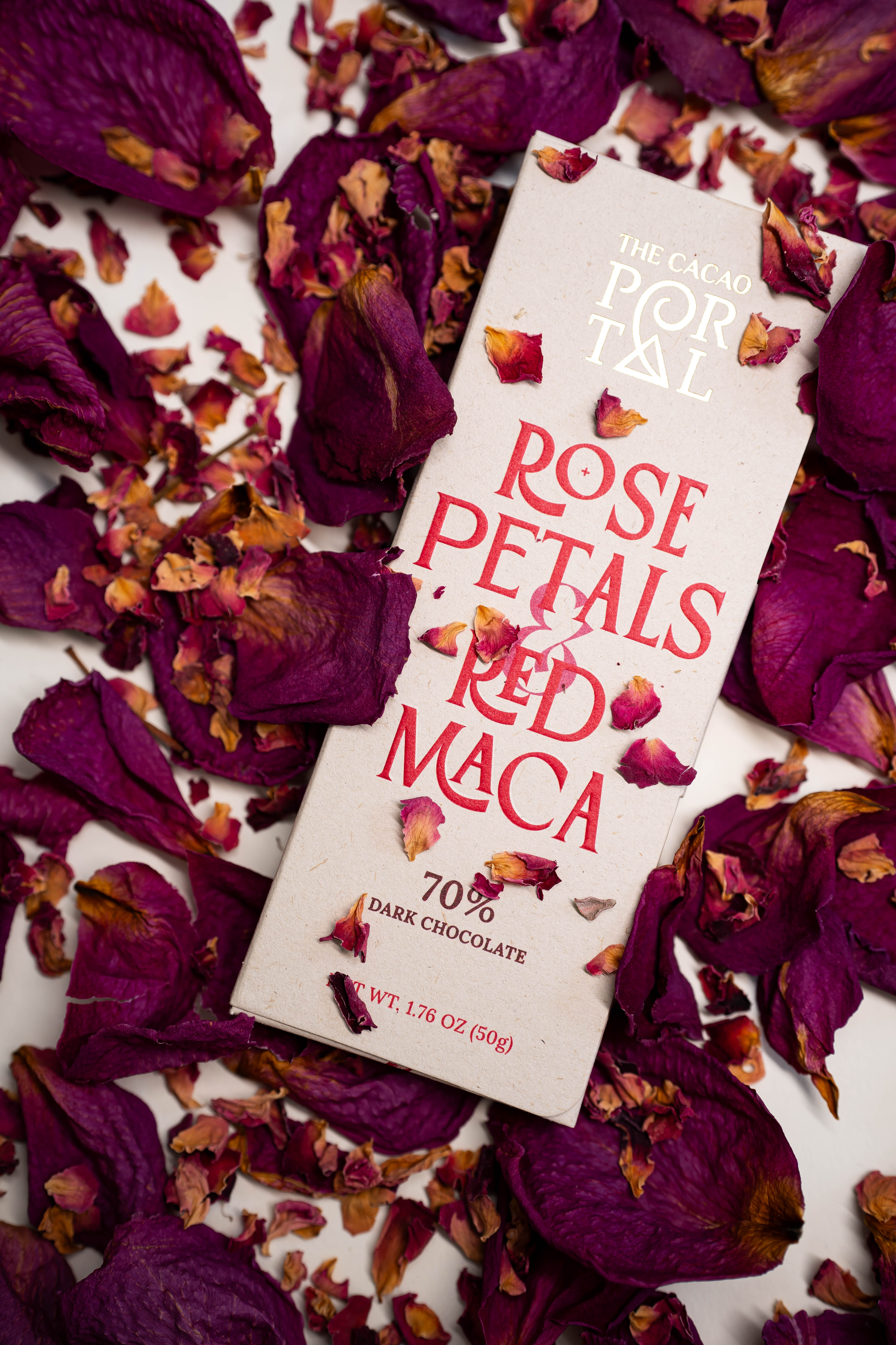 Crafted with the floral essence of centifolia rose, the grounding power of red maca, and the bold richness of 70% dark chocolate, this bar is a sensuous, uplifting experience in every bite.