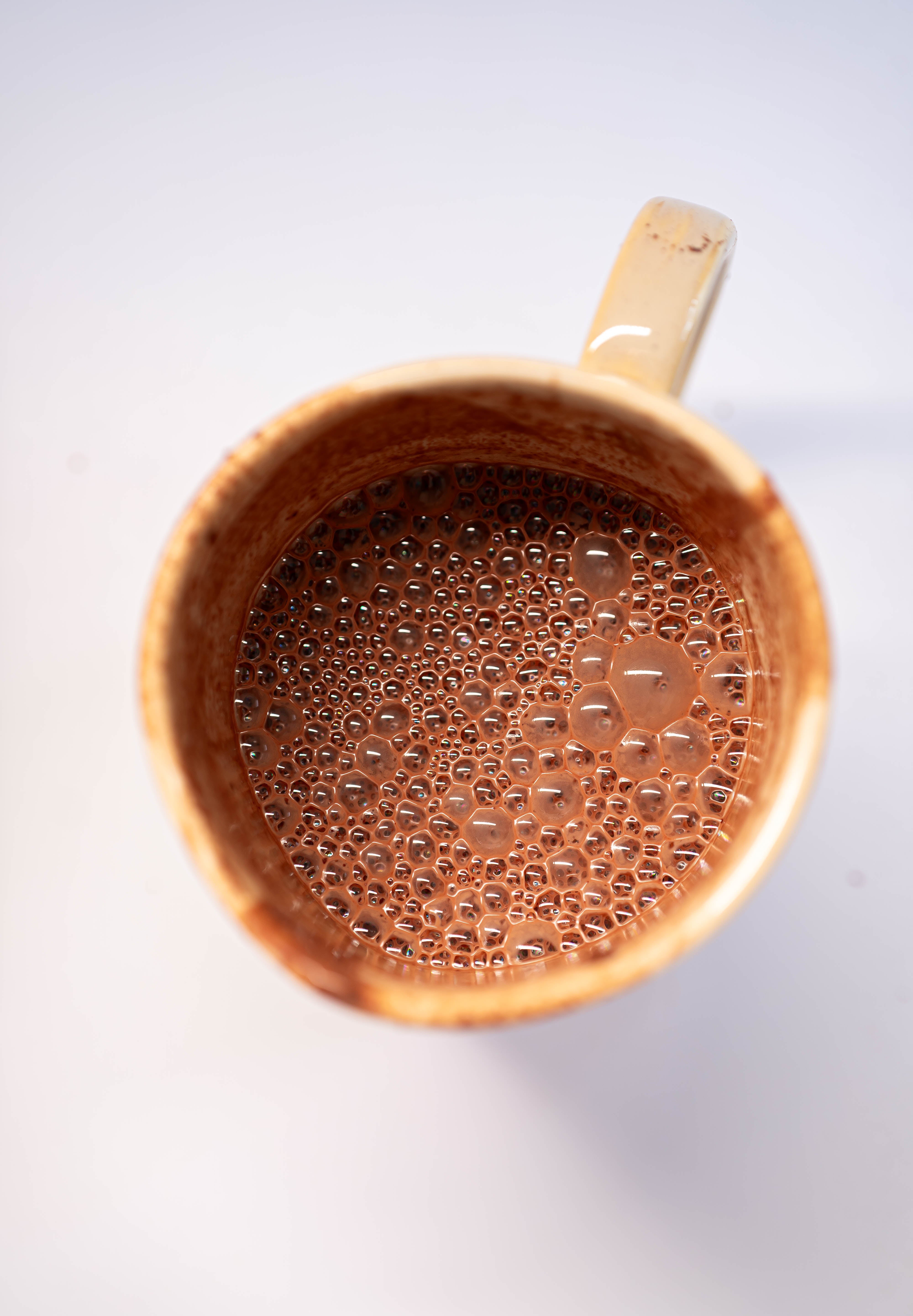 - Add the boiled water/milk to your cup with chopped cacao, let the Cacao brew and dissolve for a couple minutes, and mix and froth with a manual or electronic whisker.